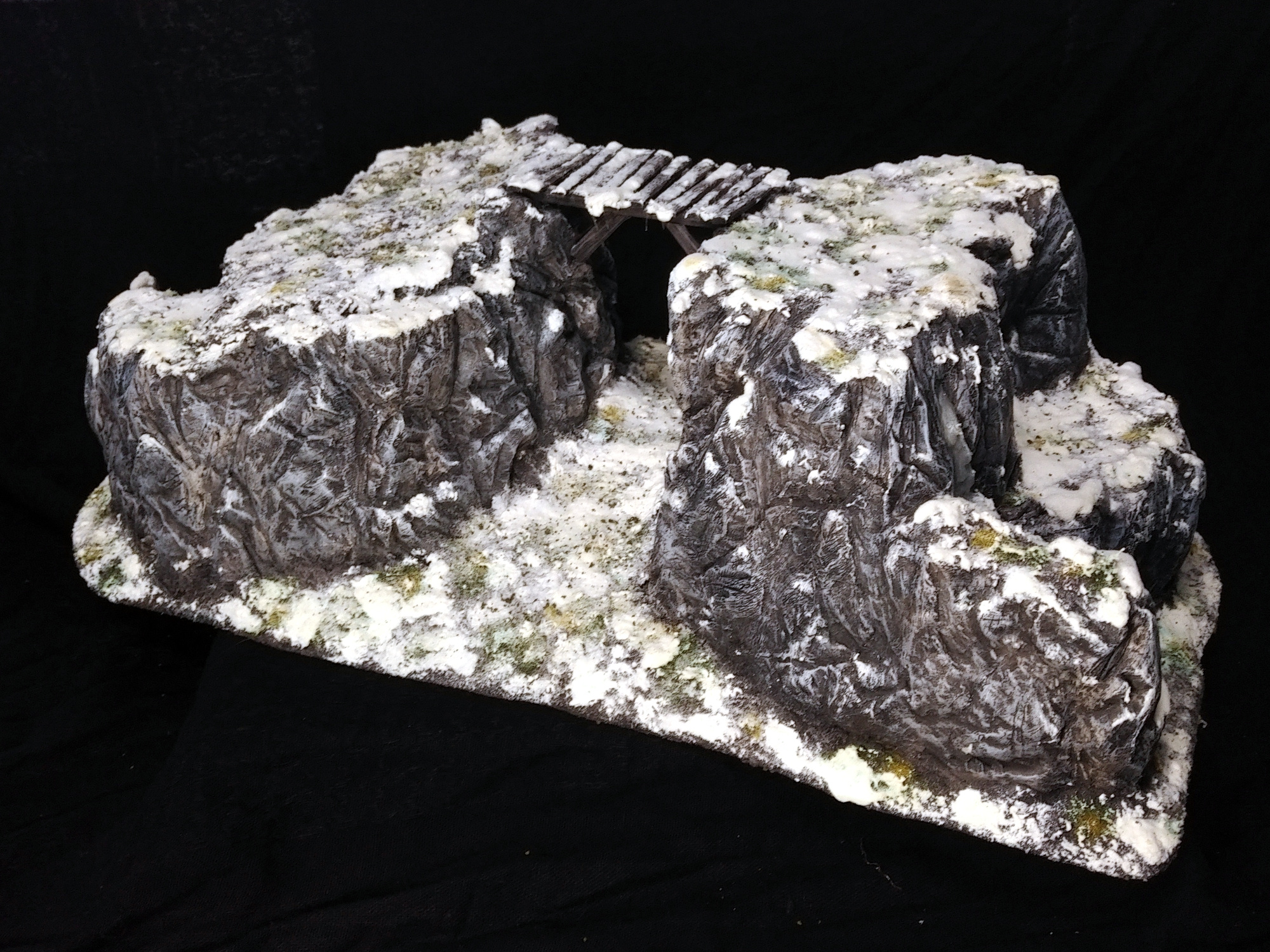 Das Herzstück des ganzen ist der wirklich große Klippenkomplex mit Kluft in der Mitte. Der hat wirklich Spaß gemacht. An dem konnte ich viel ausprobieren und an Details herumbasteln. So hatte ich bei den Felsen zum größten Teil versucht aus alufolie Gußformen zu basteln und mir einzelne Felsenstücke aus Gips zu gießen um sie anschließend an den Felsen zu kleben. Hat auch ganz gut geklappt, aber direkt Gips drauf und dann schnitzen geht finde ich besser. Ein schönes Detail sind auch die Eiszapfen an der Brücke. Oder der auf den Fotos leider nicht zu sehende kleine zugefrorene Wasserfall.