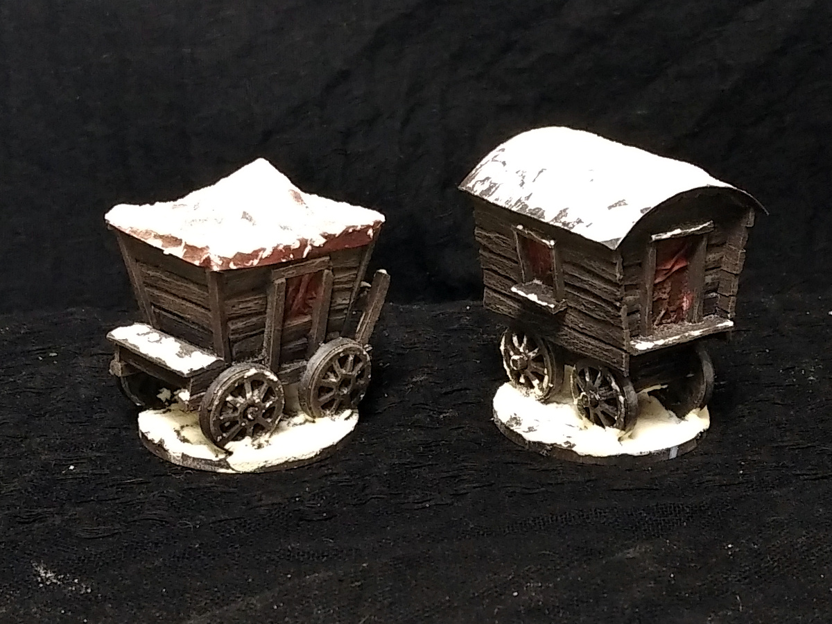 Als Missionsmarker für das ein oder andere Überfall Szenario gab es dann auch noch zwei Kutschen gebaut. Die beiden machen mir immer wieder besonders viel Spaß und ich muss auch einfach unbedingt mal ein paar für Sonnigeres Wetter bauen, damit ich sie etwa für Saga oder Muskets & Tomahawks verwenden kann.