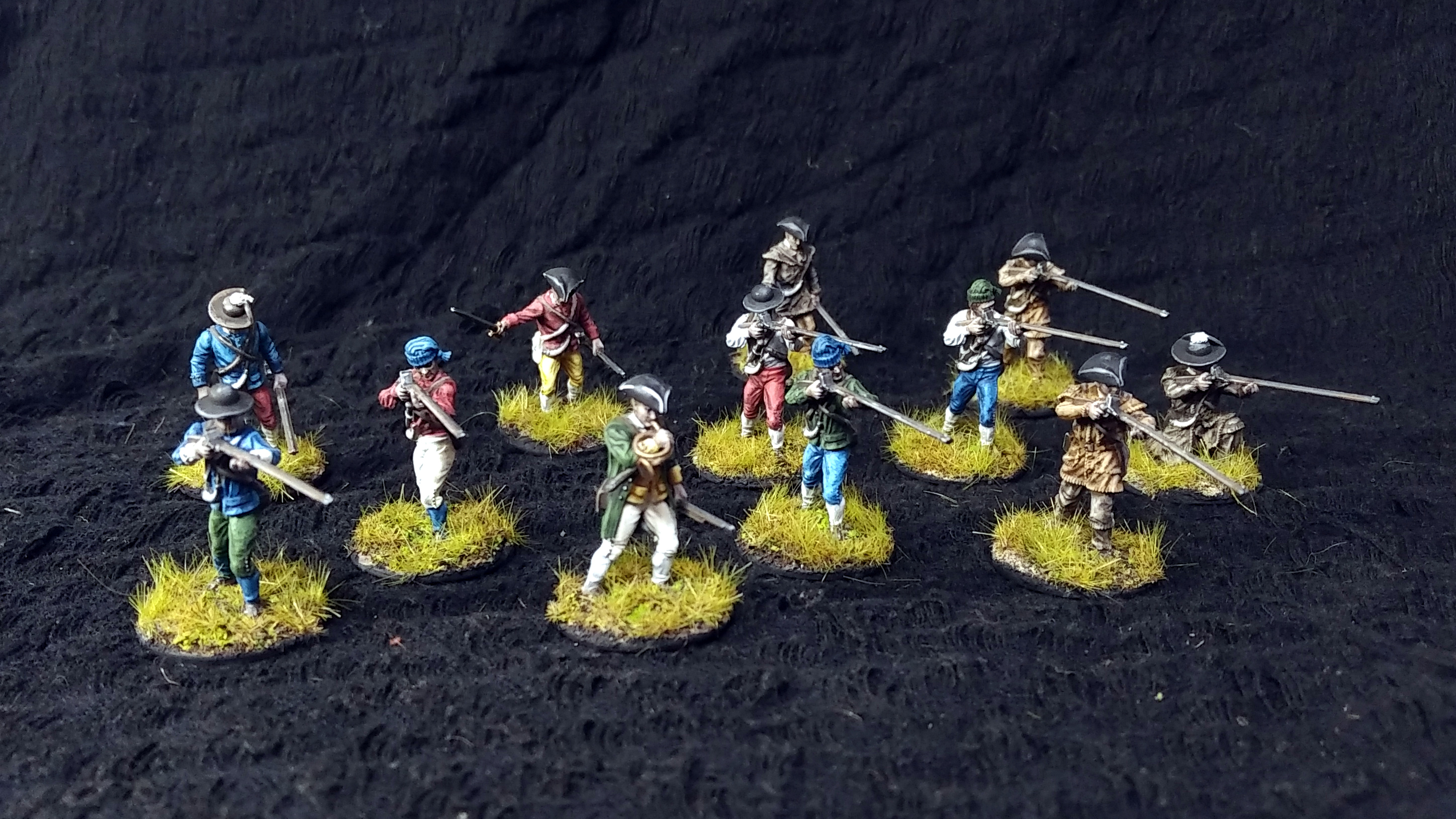 Ich selbst hab mich wieder ins 18. Jahrhundert begeben und meine Milizen für Muskets and Tomahawks bemalt. Ob die jetzt Torries oder Yankees sind wissen sie selbst noch nicht so genau und ich vermute das wird auch noch das ein oder andere mal umschwenken.