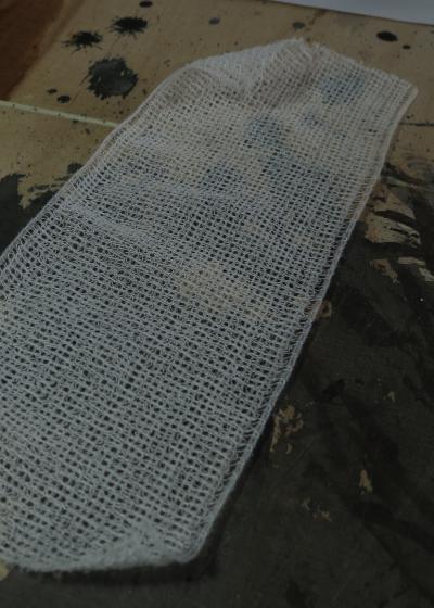 Man nimmt sich eine Mullbinde als Unterlage, da diese schön flexibel ist und trotzdem später die einzelnen “Brocken” ganz gut fixiert.