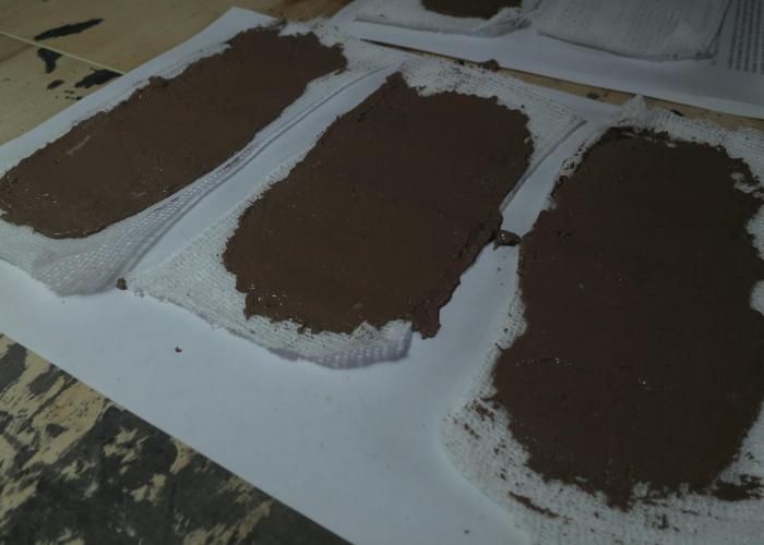 Wenn das ganze dann über Nacht getrocknet ist, werde ich mir die Stücke zurecht schneiden und auf die Platte kleben. Die Kanten werden dann nochmal mit einem Gips/Sand Gemisch verspachtelt und ich denke ich werde zum Schluss nochmal eine Schicht verdünnten Leim über alles laufen lassen, um die Bruchstücke noch ein wenig stabilere zu machen.