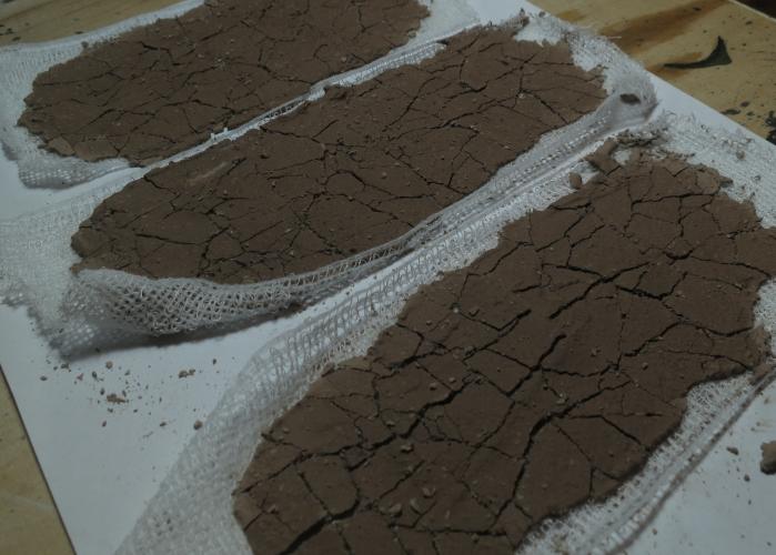 Sobald das ganze ein wenig an getrocknet ist kann man die Gipsplatten nach Lust und Laune auseinander brechen. Die Mullbinden kann man dann auch gut ein wenig in die Länge und die Breite ziehen, damit die Risse gut rauskommen.
