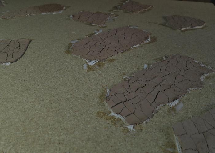 Nachdem die Gipsplatten fertig durch getrocknet waren, habe ich den Großteil der überstehenden Mullbinde abgeschnitten und manchen der Platten nochmal in kleinere Stücke aufgeteilt. Die einzelnen Patches wurden dann in recht Random über die Platte verteilt und aufgeklebt. Sieht zwar cool aus, würde ich aber das nächste Mal anders machen und eher so etwas wie einen ausgetrockneten Flusslauf entstehen lassen, oder die Platten näher bei einander in der Mitte positionieren und drum herum dann eher “normalen” Sand hin klatschen. Naja, es gibt immer tolle neue Ideen wenn man gerade am Basteln ist. So hat man wenigstens immer was neues zu tun.