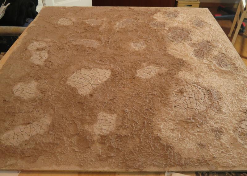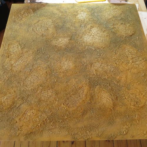 Beim Bemalen hatte ich zuerst überlegt ob ich zuerst ganz klassisch schwarz grundiere und es dann bemale. Jedoch habe ich mich an eine Technik aus dem Eisenbahnmodellbau erinnert, bei der sie Gipsflächen einfach nur mit stark verdünnter Farbe bepinseln. So habe ich dann auch die untersten Schichten gemacht. Mit einer Mischung aus mehreren helligkeitsstufen an unterschiedlichen Stellen, gab dass dann eine wirklich schöne, natürliche Grundfarbe. Nachdem das alles Getrocknet war, kam nochmal sehr stark verdünntes sehr dunkles Braun drüber. Zum Schluss wurde alles nochmal trockengebürstet, einmal mit ner hellen Sandfarbe und zum Schluss mit (fast) Weiß. Bin so eigentlich recht zufrieden mit der Bemalung. Abschließend wir das ganze Brett noch mit Klarlack versiegelt.