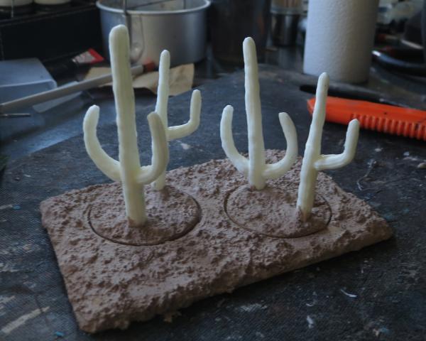 Wie schon bei der Platte ist der Boden mit stark verdünnter Sandfarbe bemalt, mit einem dunklen Ton gewasht und nachher in verschiedenen Helligkeitsstufen gebürstet. Die Kakteen haben ein etwas dunkleres Grün-Braun (mit ein wenig Nass in Nass Schatten) als Grundfarbe bekommen und dann verschieden helle Mischungen aus Sandfarbe und grün. Gerade mit dem Farbton der Kakteen bin ich sehr zufrieden.