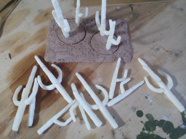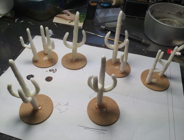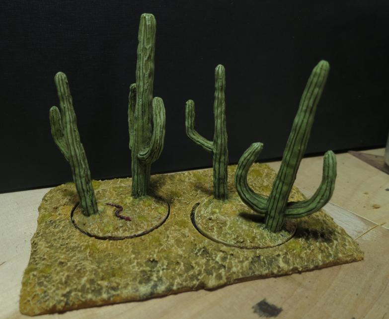 Die Base habe ich in aus dünnem MDF in je zwei ungefähr gleich große Rechtecke geschnitten und mit der Lochsäge schöne Kreise in eins der beiden geschnitten. Die Kakteen werden auf die runden Scheiben geklebt, so dass man diese schön raus nehmen kann, um eine bessere Bespielbarkeit zu gewährleisten.