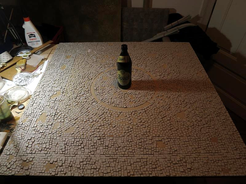 Zum Glück habe ich gute Connections in der Papierverarbeitung, so dass ich schön unterschiedlich dicke Pappstreifen bekommen konnte, die ich nur noch auf einigermaßen quardratische Steinchen schnippel musste. Das hat schonmal einiges an Arbeit erstpaart. Das aufkleben war hat trozdem gefühlt ewig gedauert. Immer wieder Kleistern und Steinchen setzen, Kleistern und Steinchen, …