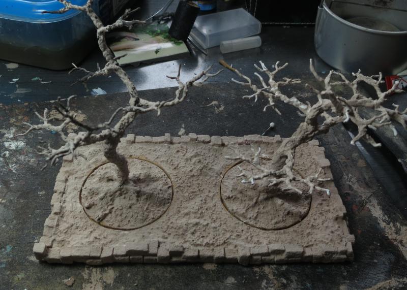 Schon vor einer weile hatte ich mal überlegt wie man am besten ein bisschen Wald auf eine Stadtplatte bringen kann ohne dass es irgendwie fehl am Platz wirkt. Ich bin dann nach etwas überlegen auf “Begrühnungsinseln” (für ein gesünderes Malifaux) gekommen und habe ich gleich mal einen ersten Prototyp gebastelt:
