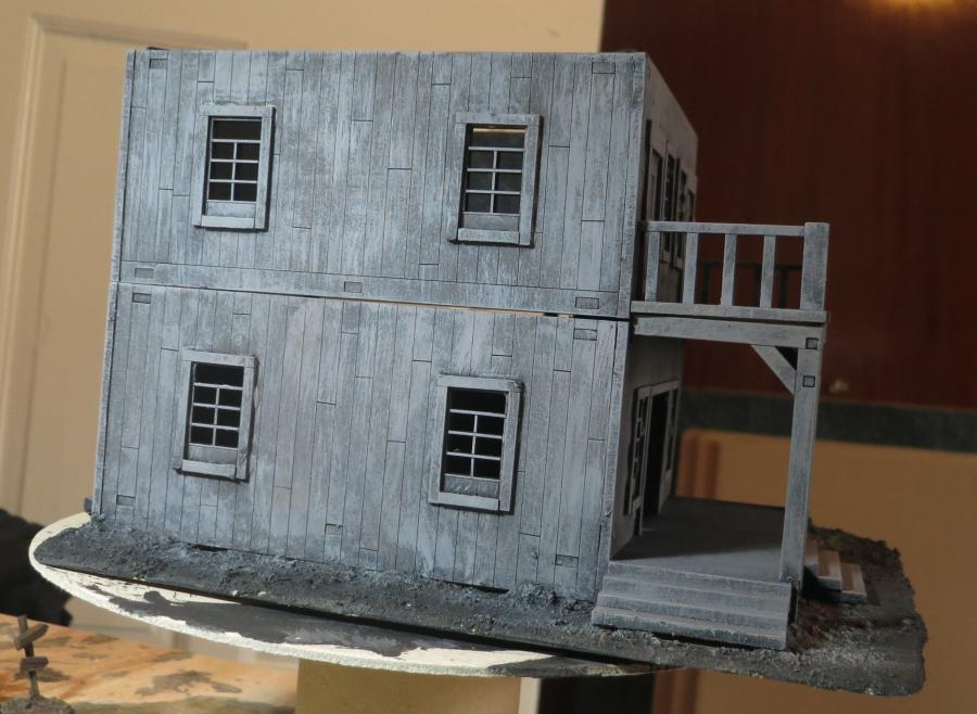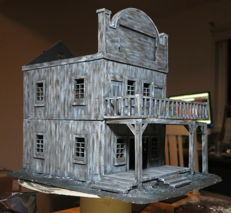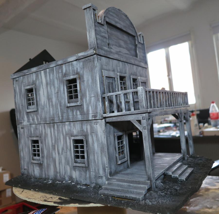 Das war die erste Schichte nachdem ich den ganzen Saloon einmal schwarz bemalte hatte. Einfach nur sehr grob ein grau (mit einem ticken braun) immer schön vertikal drüber gebürstet. Sah schon mal ganz nett aus.