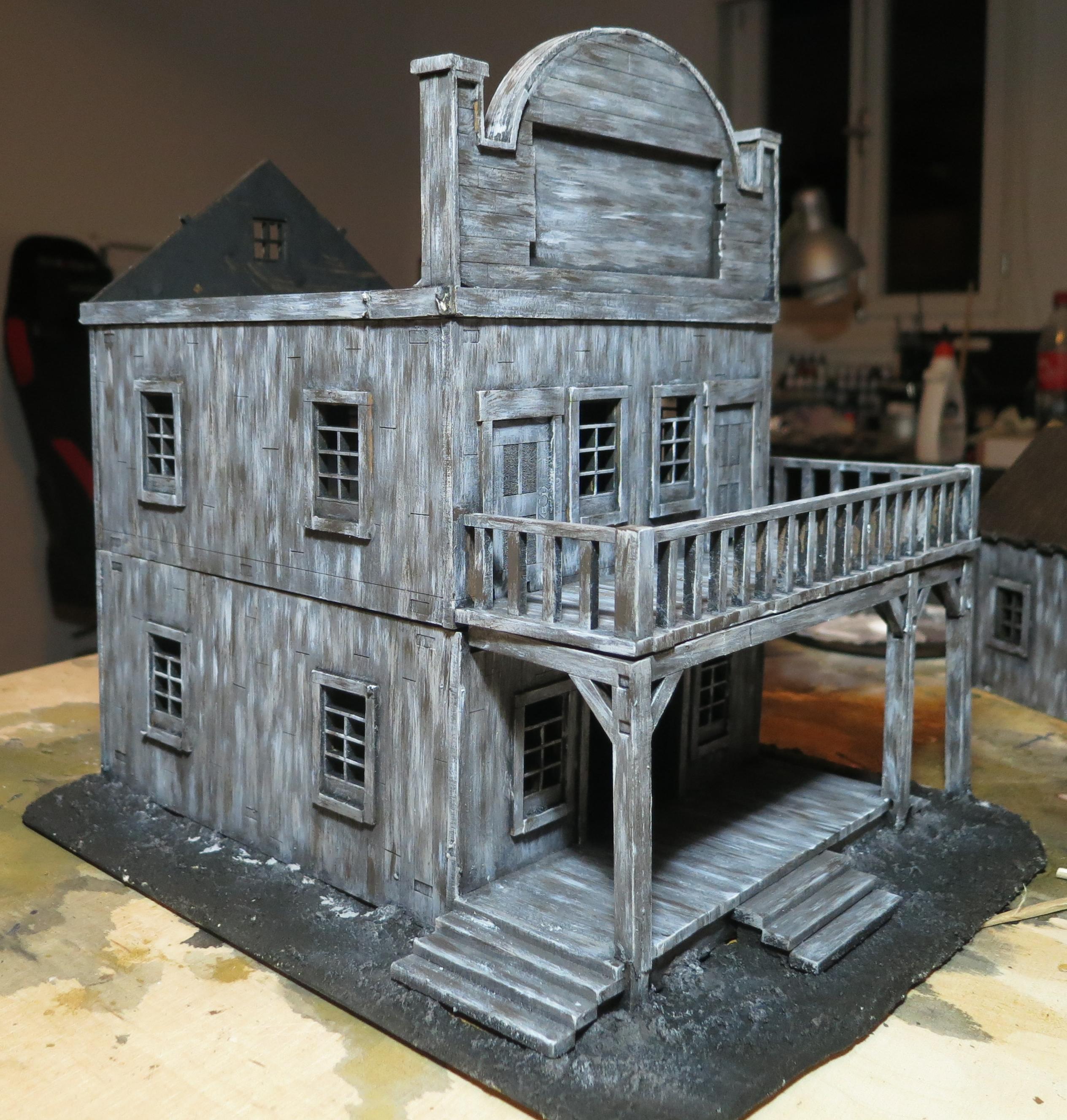 Also beschloss ich mich heute noch an den Saloon zu setzen, bevor ich mit Wäldern weitermache. Aber irgendwie hatte ich keine Lust auf normales 08-15 Grundfarbe + Trockenbürsten bemalen und wollte mal ein bisschen mit dem malen von alten verwittertem Holz herumprobieren. Das hat mich zwar deutlich mehr Zeit gekostet. Aber ich bin so zufrieden damit wie es bisher aussieht, dass ich heute Abend noch ein Work-In-Progress Bilder mit euch teilen möchte.