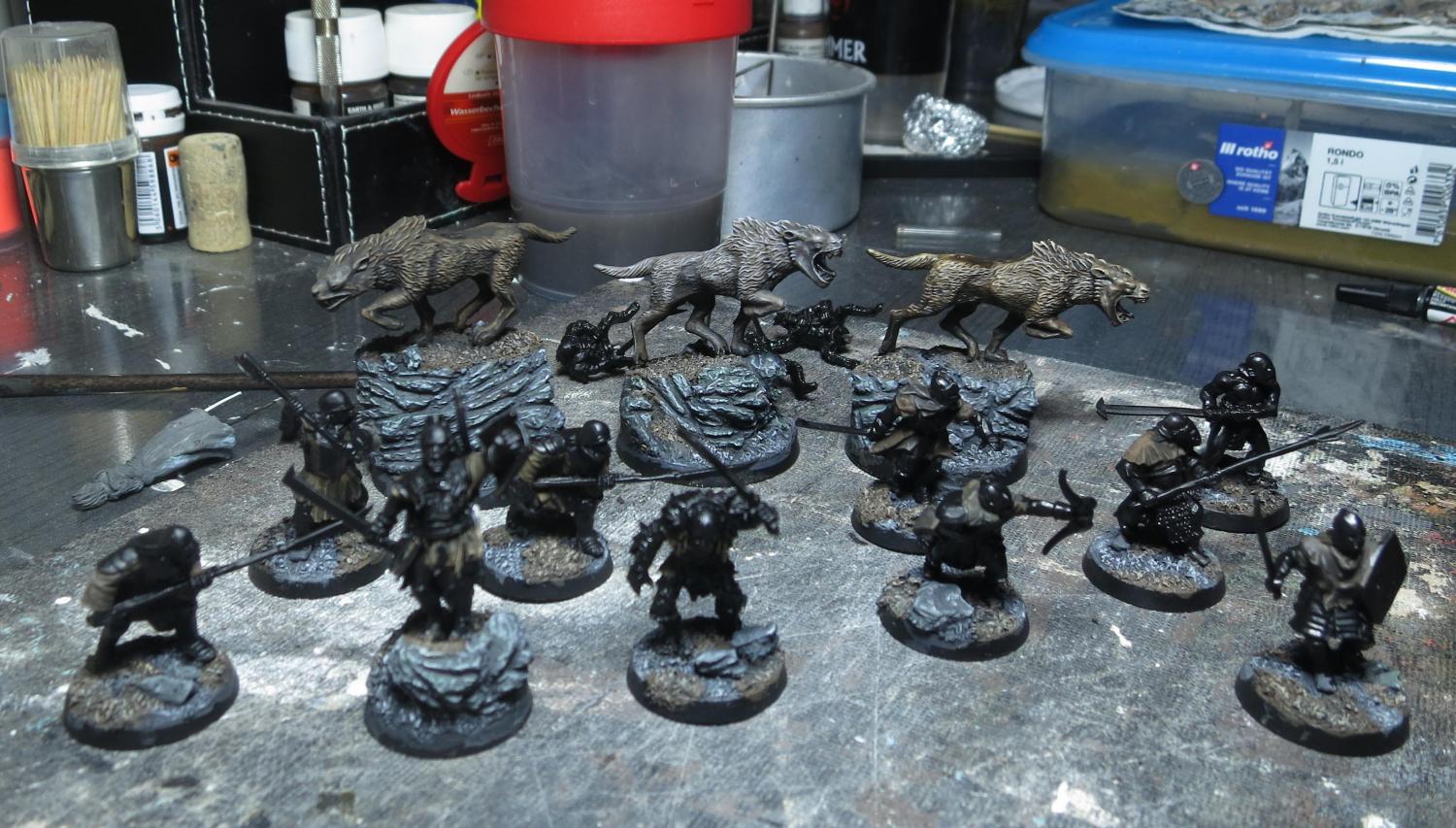 Drei Warge habe ich jetzt fast fertig bemalt. Die Reiter fehlen allerdings noch. Hier und da hab ich schonmal ein paar Lederteile bei Orks und Uruks bemalt. Insgesamt soll die Truppe in ledrigen dreckigen Brauntönen gehalten werden. Für die Basegestaltung hatte ich so eine Art “Furten des Isen” im Kopf. Ein bisschen Klippen, ein bisschen Kies, ein bisschen Wasser und ein bisschen Gras. Ich bin mal gespannt wie dass dann später aussieht.
