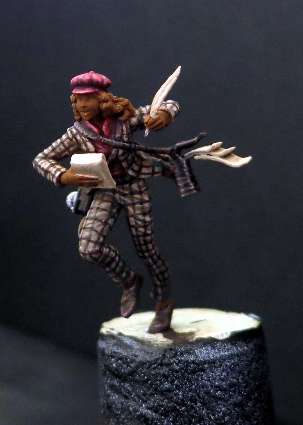 Furchtlos steht die Reporterin mitten im Gefecht, während ihr die Kugeln um die Ohren fliegen. Das Ortega-Thema habe ich mit ein wenig fliegendem Blei dargestellt. Aus geschmolzenen Plastikteilen und ein wenig Modelliermasse habe ich an die Haaren und die Tasche vorbei zischenden Kugeln gebastelt. Vielleicht ist es nicht auf anhieb erkennbar. Aber ich bin recht zufrieden damit.