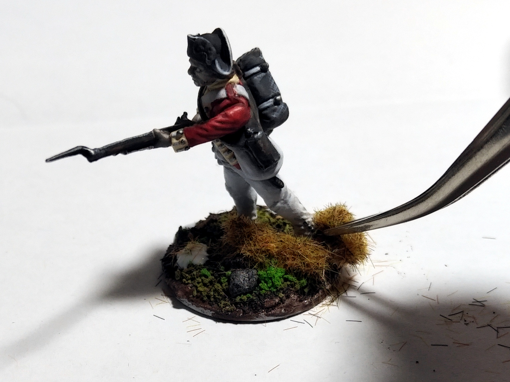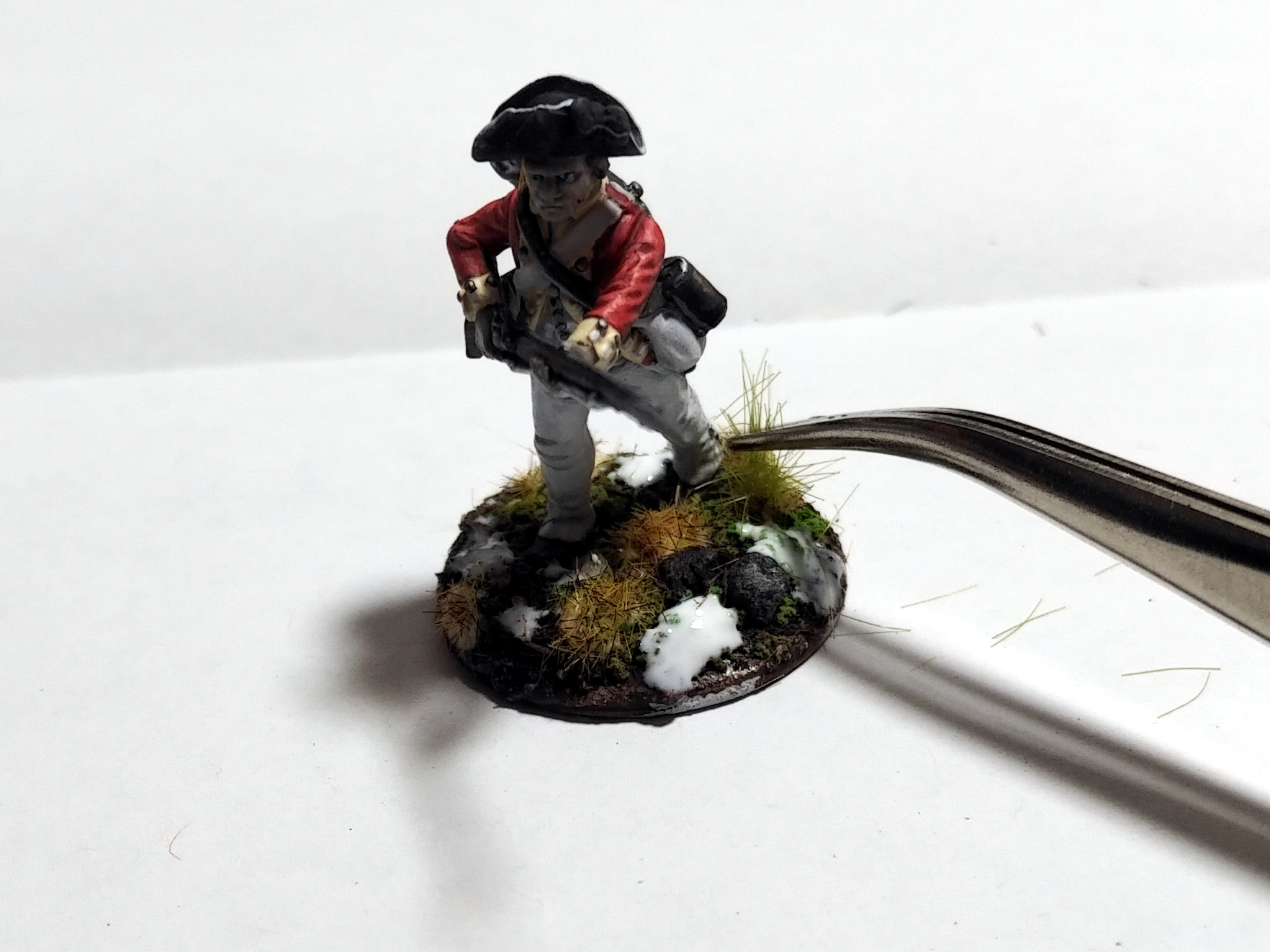 Nachdem die Base nun getrocknet ist wird es Zeit für ein wenig Gras. Ich appliziere immer mit dem Pinsel einen kleinen Tropfen Leim und drücke mit der Pinzette einen Büschel Gras hinein.