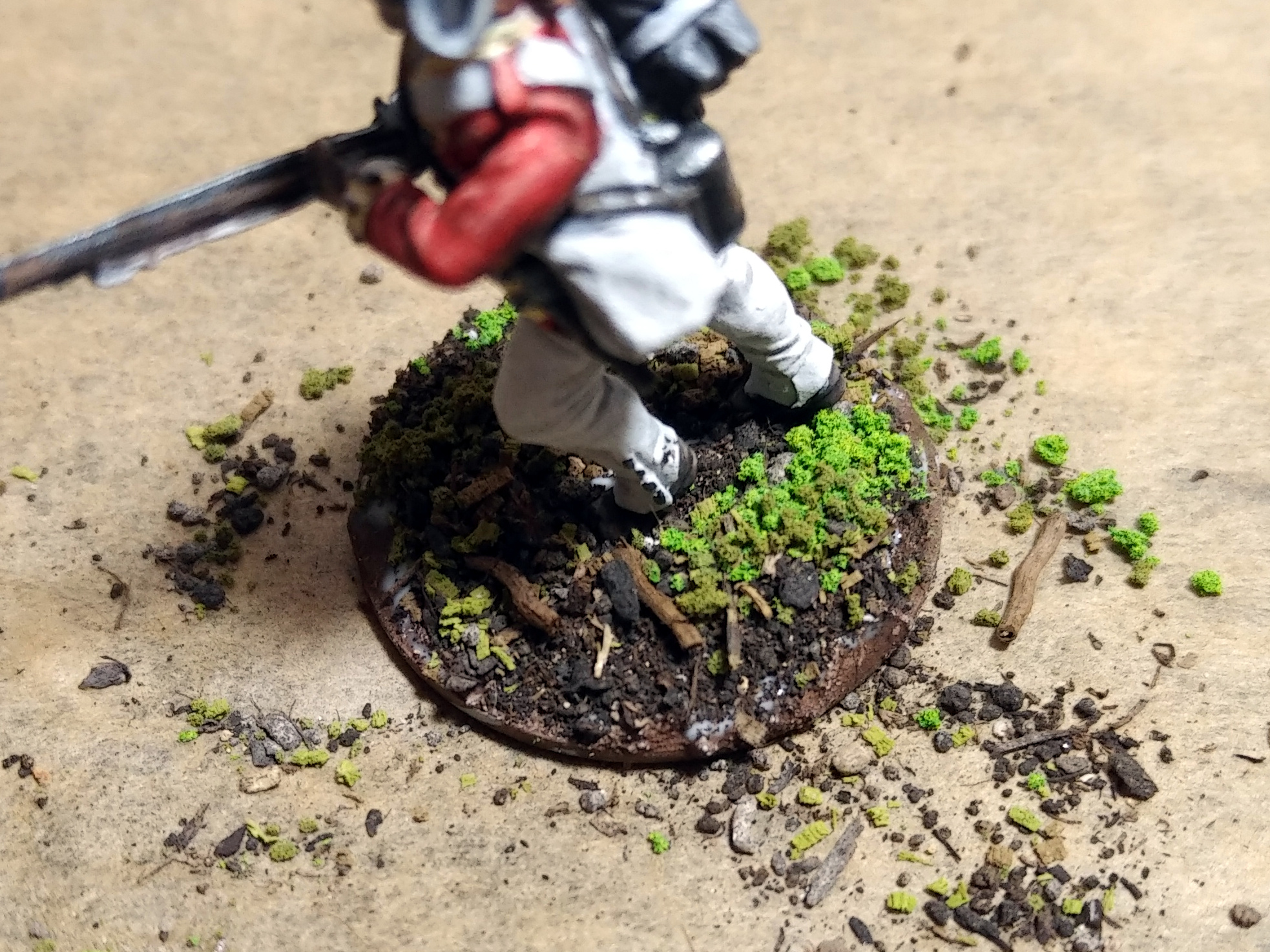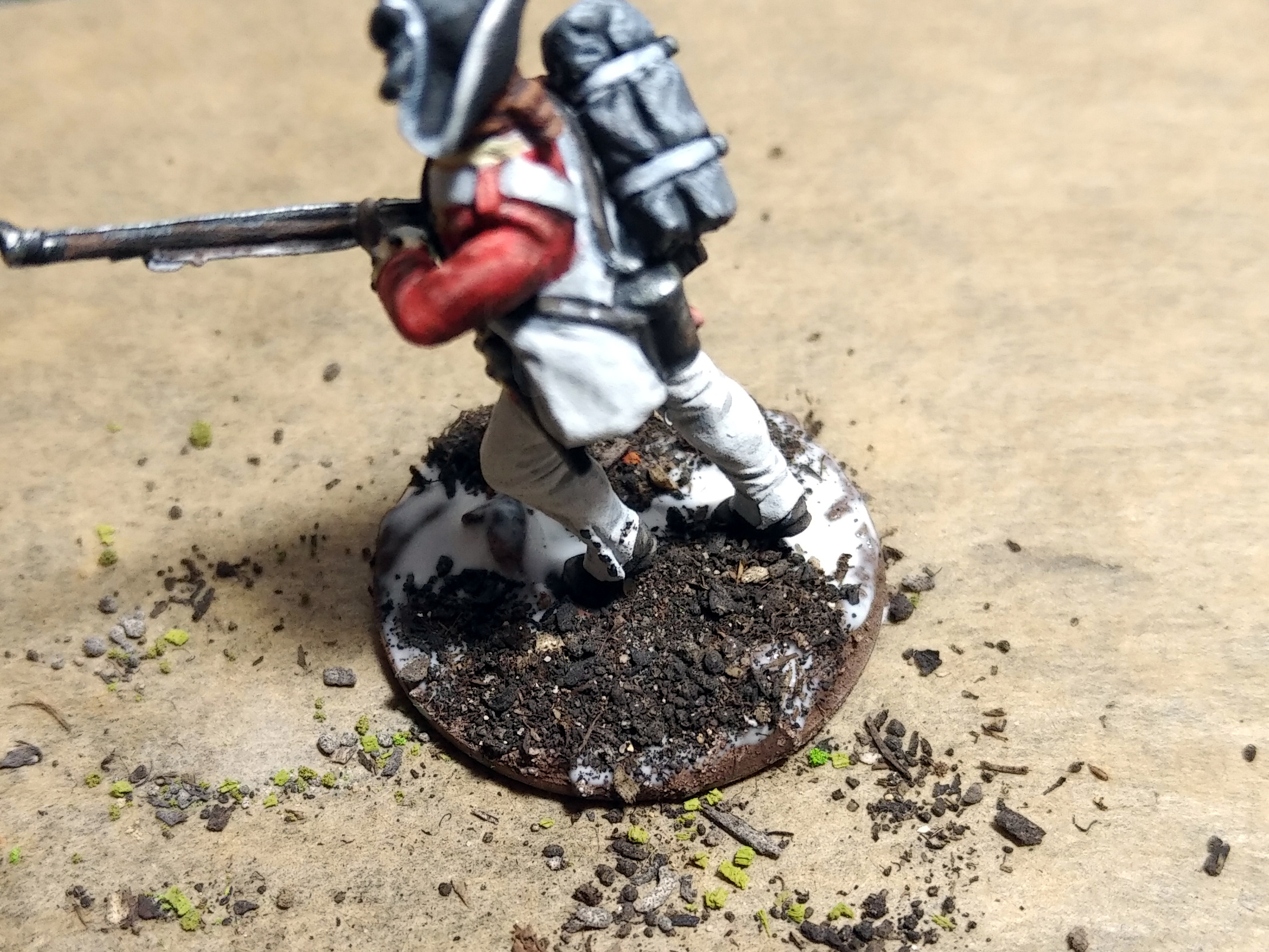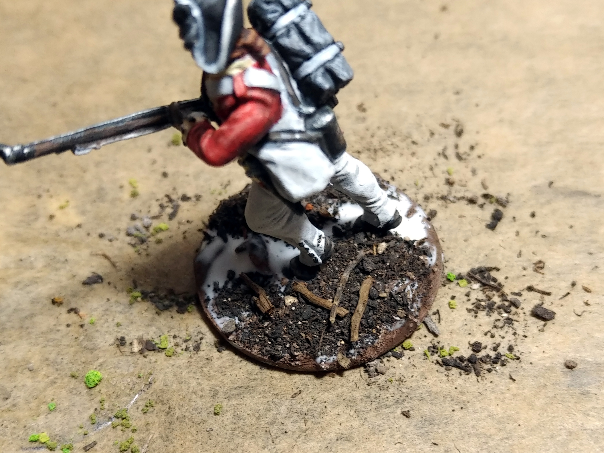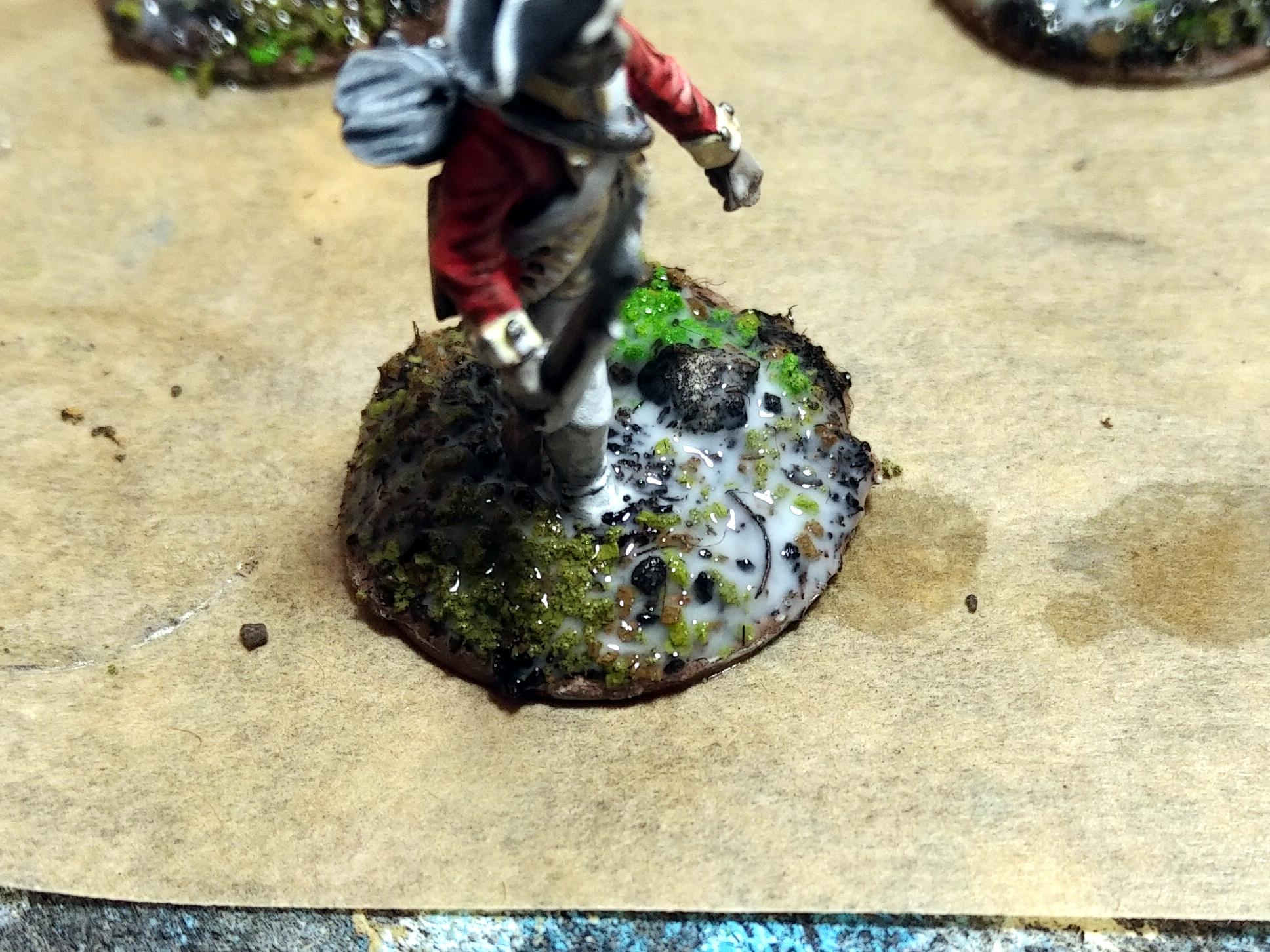 Inzwischen wird an meinen Bases für Spiel-Miniaturen extrem wenig gemalt. Irgendwann während des Bemalens der Miniatur wird zwischendurch mal die Base kurz Braun gepinselt. Für den Fall dass doch mal ein wenig Farbe durch die Base-Gestaltung durchschimmert. Bei rein schwarzer Grundierung kann man den Schritt aber auch getrost weglassen. Vermutlich auch bei jeder anderen Grundierung, aber irgendwie finde ich es ab einem gewissen Zeitpunkt beim malen immer ganz nett wenn die Base schonmal ne Farbe hat.