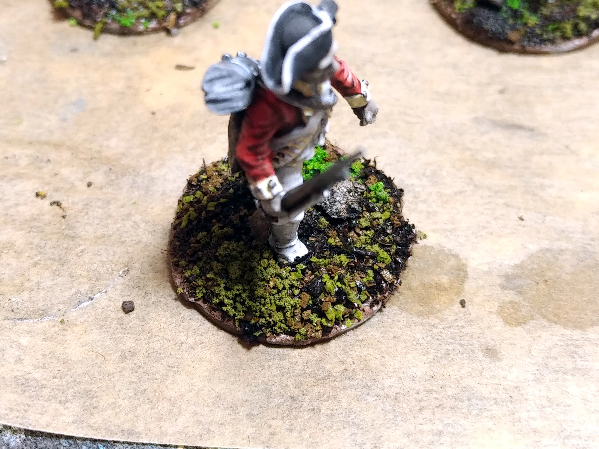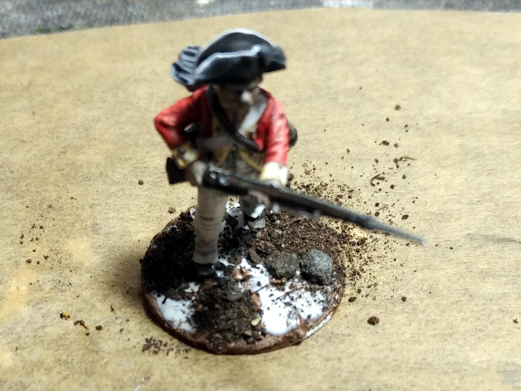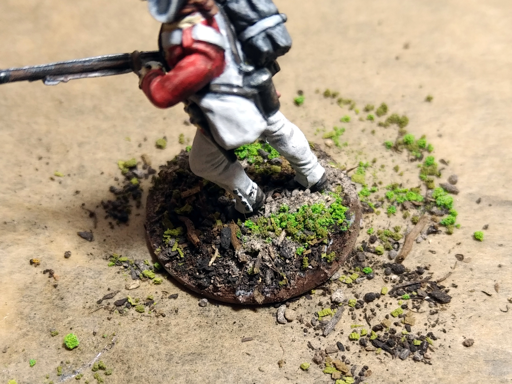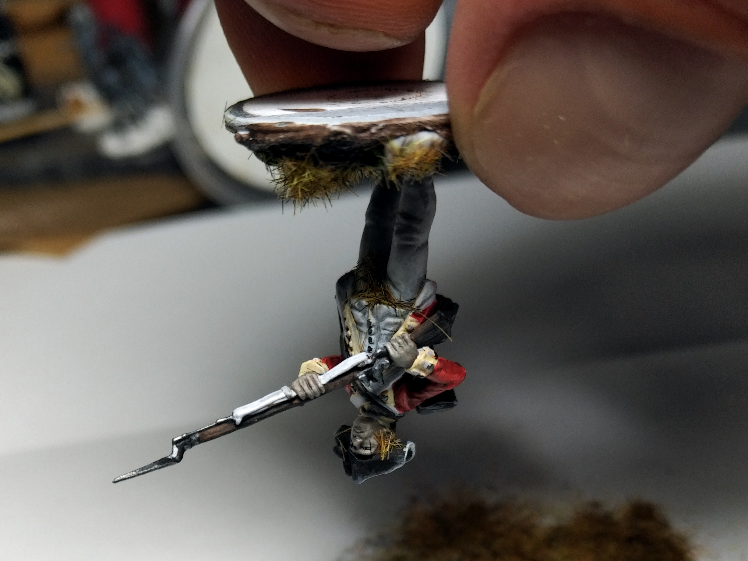 Inzwischen wird an meinen Bases für Spiel-Miniaturen extrem wenig gemalt. Irgendwann während des Bemalens der Miniatur wird zwischendurch mal die Base kurz Braun gepinselt. Für den Fall dass doch mal ein wenig Farbe durch die Base-Gestaltung durchschimmert. Bei rein schwarzer Grundierung kann man den Schritt aber auch getrost weglassen. Vermutlich auch bei jeder anderen Grundierung, aber irgendwie finde ich es ab einem gewissen Zeitpunkt beim malen immer ganz nett wenn die Base schonmal ne Farbe hat.